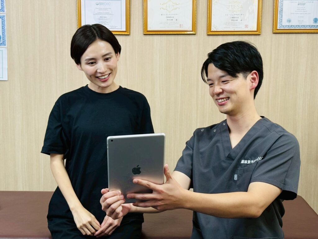 現在悩まれている症状や過去の疾患についてもお伺いしていきます。筋膜施術では過去の疾患との繋がりが大切になるので詳しく丁寧にお伺いしていきます。