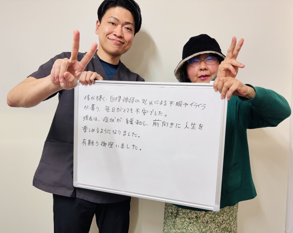 「肩関節周囲炎と膝痛で悩んでいましたが、痛みがなくなり快適に過ごせています!ありがとうございました!」